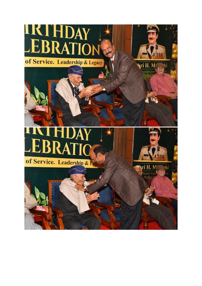 भोपाल|पूर्व डीजीपी एच. एम. जोशी का नेतृत्व मध्यप्रदेश पुलिस के इतिहास में प्रेरणादायी अध्याय डीजीपी कैलाश मकवाणा सेवानिवृत्त पुलिस महानिदेशक मध्यप्रदेश हरिवल्लभ मोहनलाल जोशी (एच.एम. जोशी) के 100वें जन्मदिवस के अवसर पर मध्यप्रदेश आईपीएस एसोशिएशन द्वारा पुलिस ऑफिसर्स मेस भोपाल में एक गरिमामय समारोह का आयोजन किया गया।समारोह में जोशी को शॉल एवं पुष्पगुच्छ भेंट कर सम्मानित किया गया। वरिष्ठ सेवानिवृत्त आईपीएस जोशी को कनिष्ठ बैच (2024) की परिवीक्षाधीन आईपीएस अधिकारी एवं सहायक पुलिस अधीक्षक, उज्जैन काजल सिंह द्वारा पुष्पगुच्छ भेंट कर सम्मानित किया गया। यह क्षण अत्यंत भावनात्मक और प्रेरणादायी था, जिसने पुलिस सेवा की परंपरा, सम्मान और पीढ़ियों के बीच जुड़ाव को भी दर्शाया।